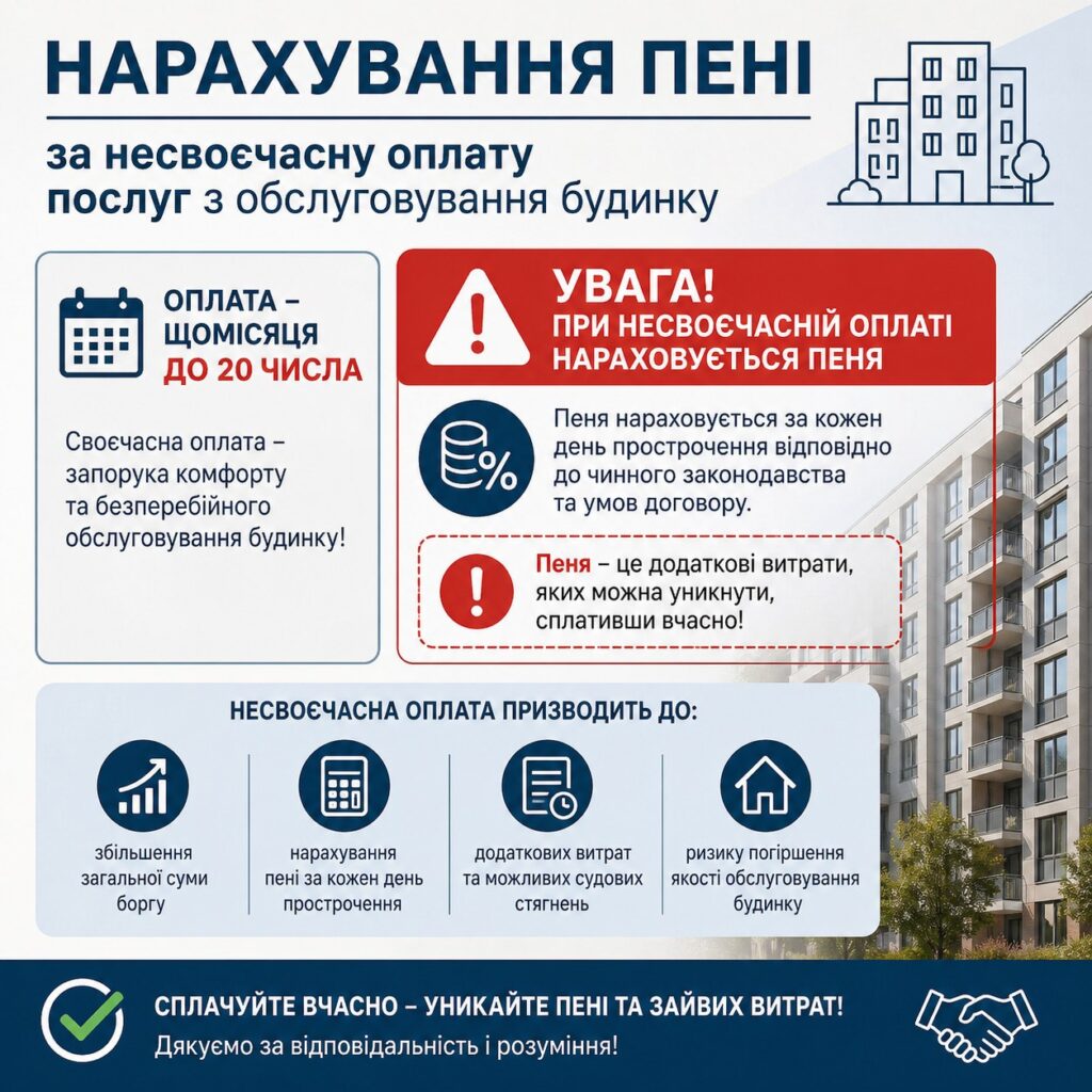Просимо відповідально ставитися до своїх зобов’язань та здійснювати оплату вчасно, щоб уникнути додаткових фінансових витрат і забезпечити комфортне проживання у будинку.